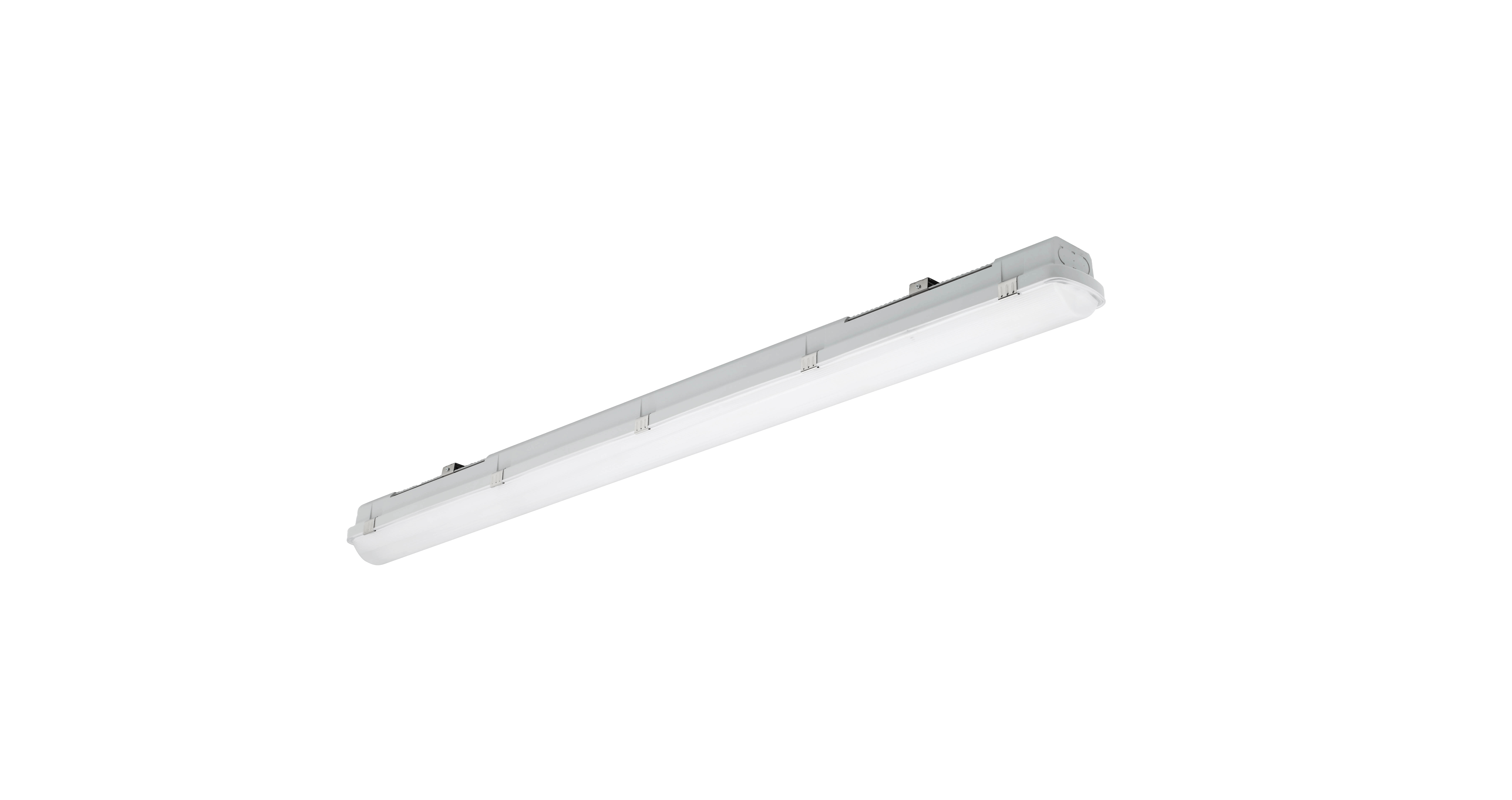 Resisto, integrierte wetterfeste LED-Leuchte mit UV-stabilisiertem Flachdiffusor, der ein gleichmäßiges Lichtbild erzeugt, die Lichtausbeute optimiert und Blendung reduziert. Diffusorclips und Befestigungswinkel aus Edelstahl 301 für die Oberflächenmontage. Gehäuse und Diffusor aus Polycarbonat – keine Gelbverfärbung mit der Zeit. 2800lm; 20W; 140lm/W; 4000K; SDCM<5; nicht dimmbar; CRI80; IP66; IK08; Klasse I; 69.000 Std. (L80B20) Lebensdauer; 1200mm x 89mm x 88mm; D-Zeichen.