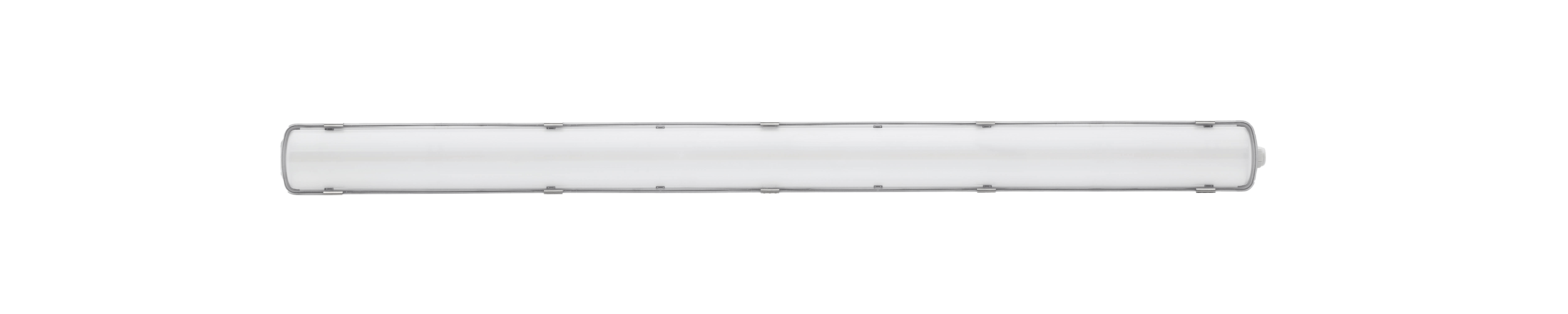 Resisto, integrierte wetterfeste LED-Leuchte mit UV-stabilisiertem Flachdiffusor, der ein gleichmäßiges Lichtbild erzeugt, die Lichtausbeute optimiert und Blendung reduziert. Diffusorclips und Befestigungswinkel aus Edelstahl 301 für die Oberflächenmontage. Gehäuse und Diffusor aus Polycarbonat – keine Gelbverfärbung mit der Zeit. 5050lm; 36W; 140lm/W; 4000K; SDCM<5; nicht dimmbar; CRI80; IP66; IK08; Klasse I; 69.000 Std. (L80B20) Lebensdauer; 1200mm x 89mm x 88mm; D-Zeichen.