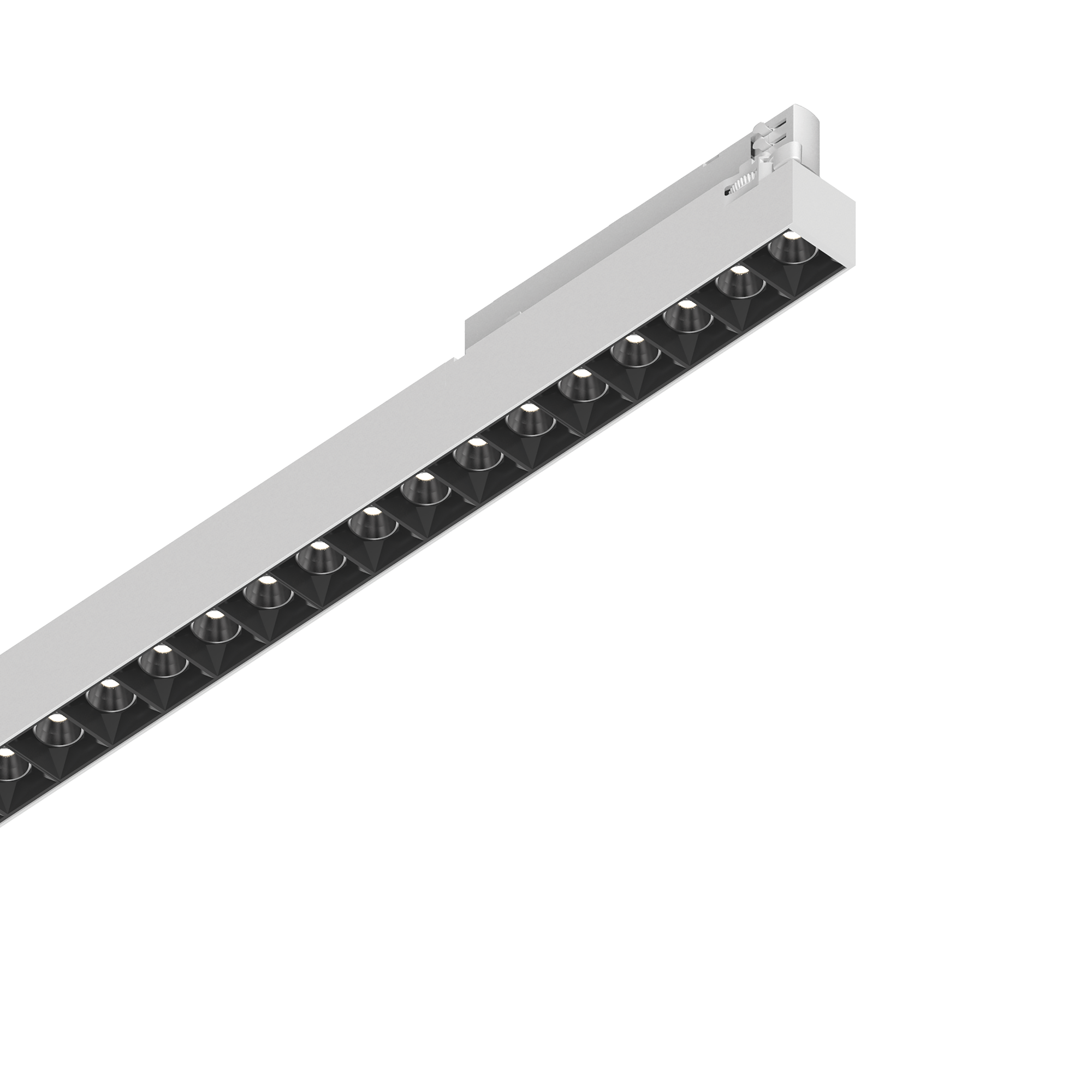 Linearprojektor aus Aluminium, geeignet für Drehstromschienenmontage (Eutrac-Standard), erhältlich in drei verschiedenen Längen und pulverbeschichtet in weißer oder schwarzer Ausführung.