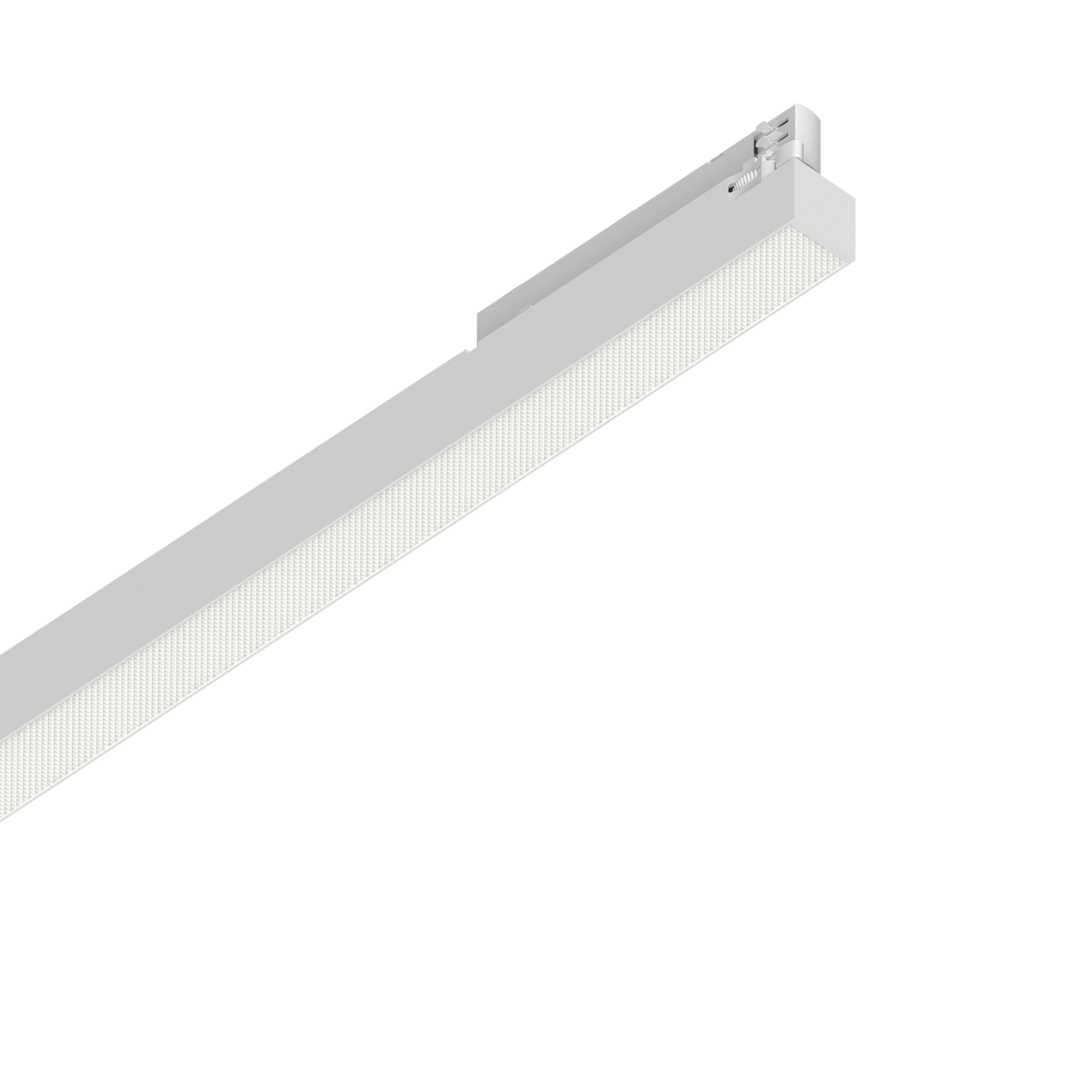 Linearprojektor aus Aluminium, geeignet für Drehstromschienenmontage (Eutrac-Standard), erhältlich in drei verschiedenen Längen und pulverbeschichtet in weißer oder schwarzer Ausführung.