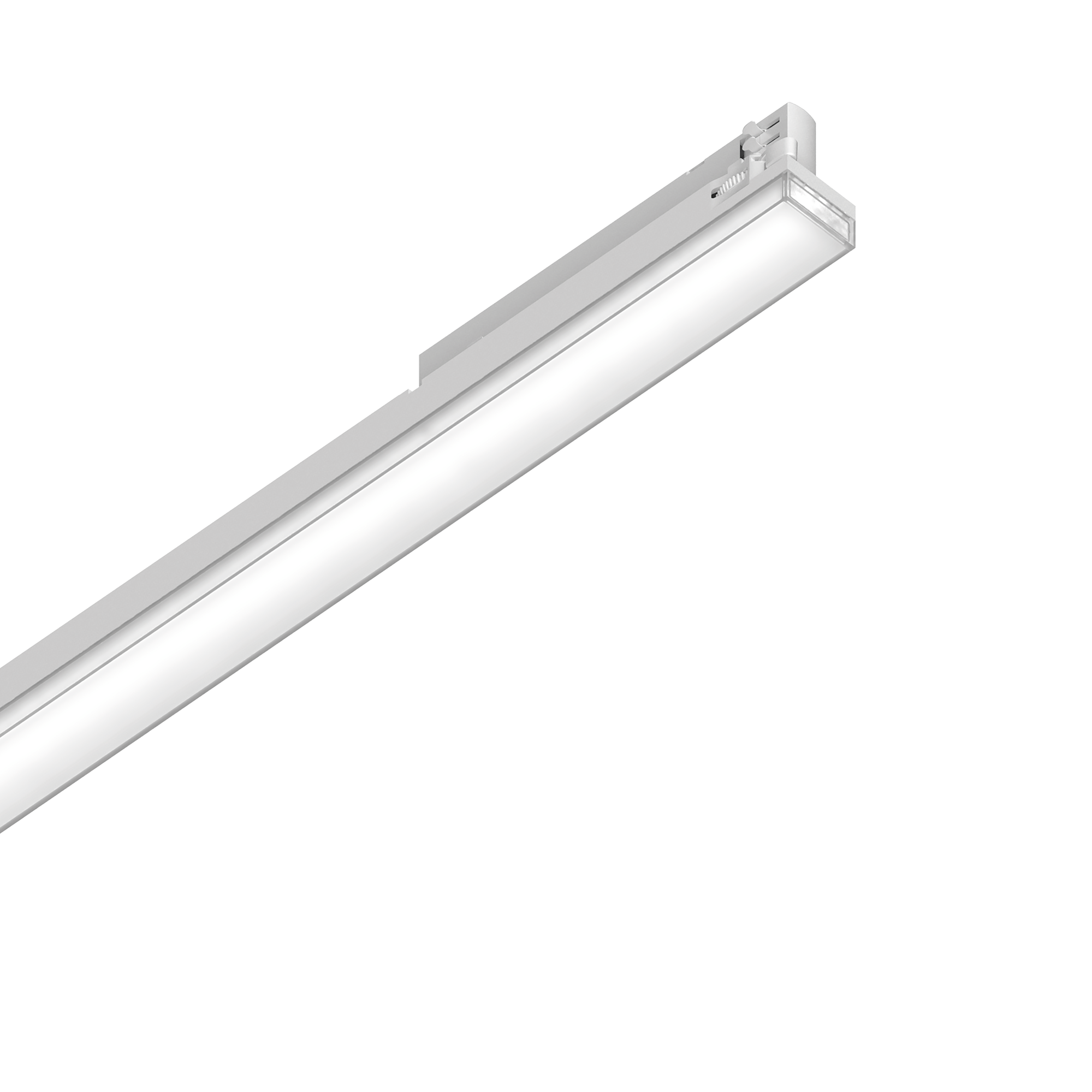 Linearprojektor aus Aluminium, geeignet für Drehstromschienenmontage (Eutrac-Standard), erhältlich in drei verschiedenen Längen und pulverbeschichtet in weißer oder schwarzer Ausführung.