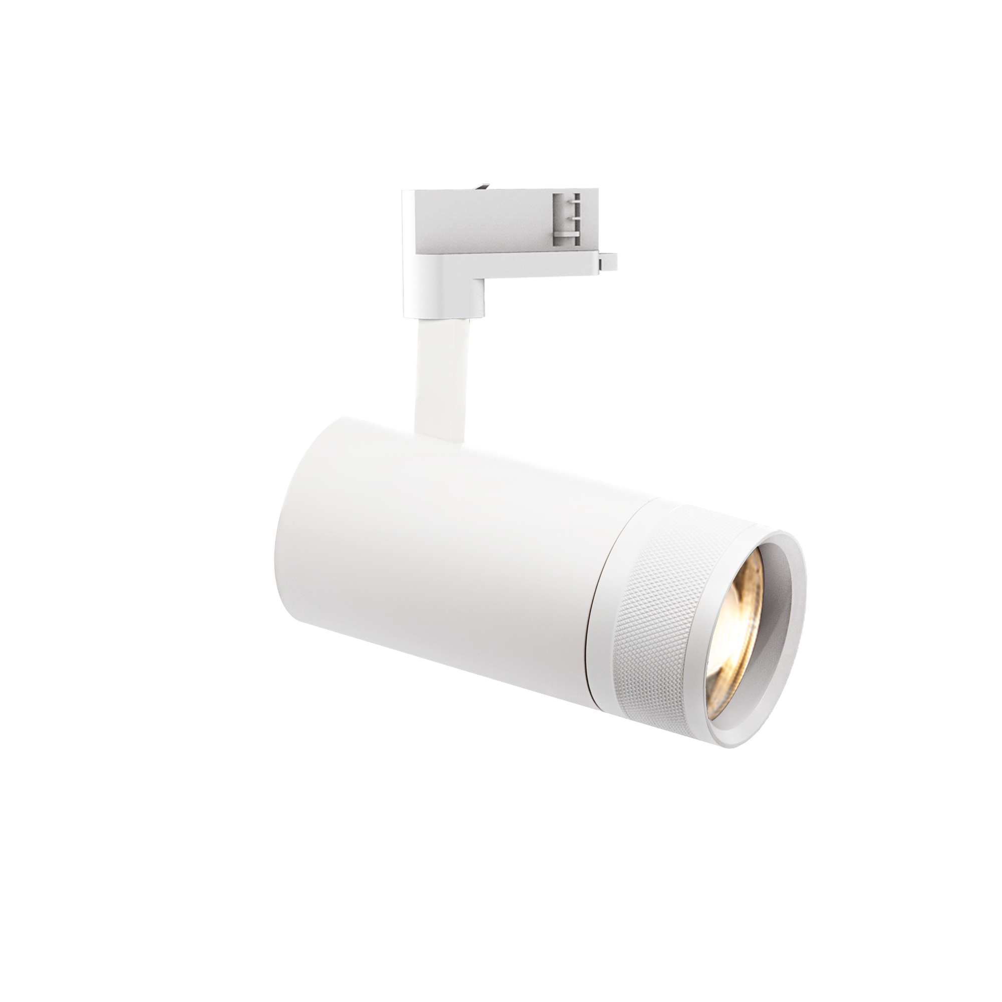 Zylindrischer Scheinwerfer aus stranggepresstem Aluminium mit variabler schmaler bis breiter Abstrahlcharakteristik (20°-55°), geeignet für die Installation an LINK Einphasen- oder Dreiphasengleisen.