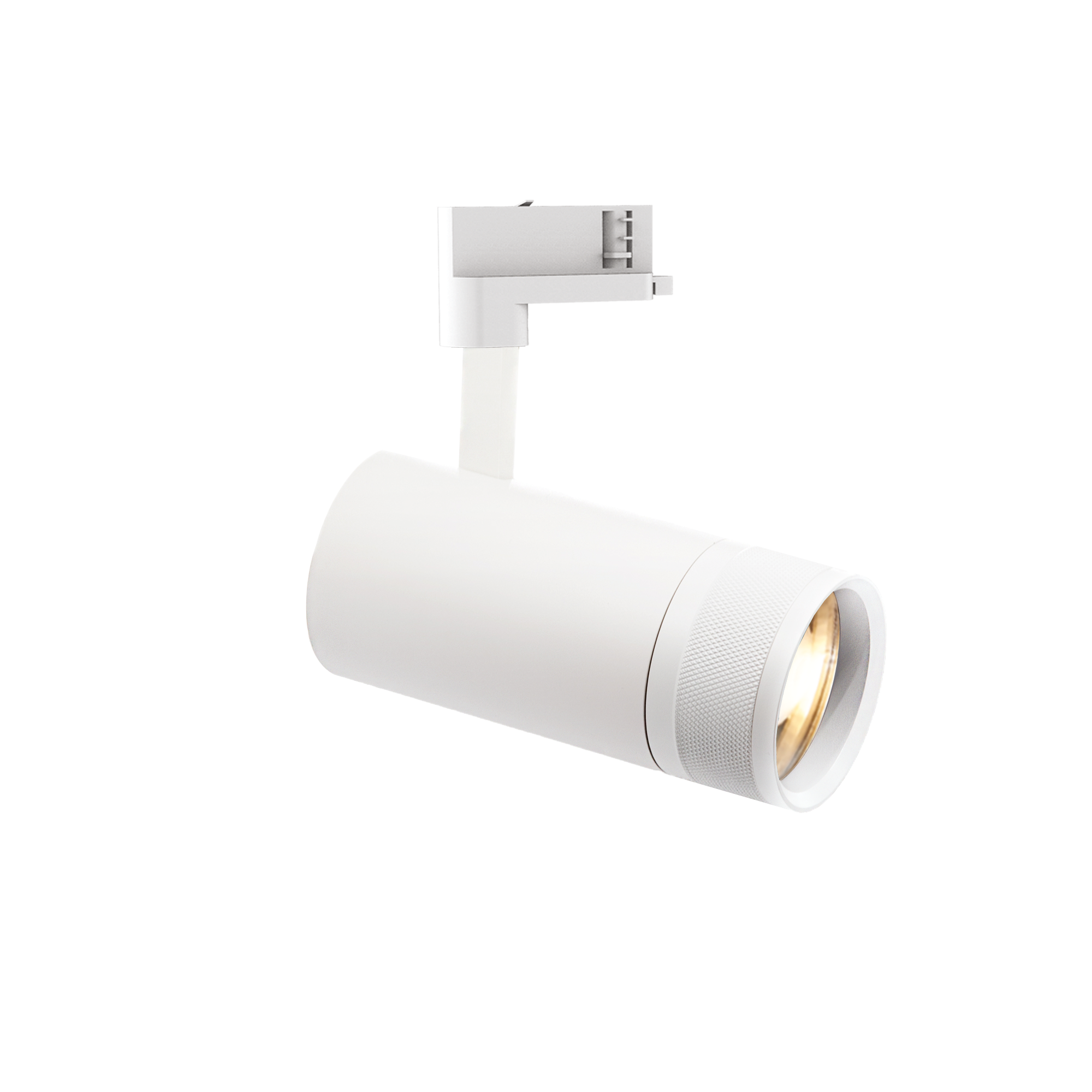 Zylindrischer Scheinwerfer aus stranggepresstem Aluminium mit variabler schmaler bis breiter Abstrahlcharakteristik (20°-55°), geeignet für die Installation an LINK Einphasen- oder Dreiphasengleisen.