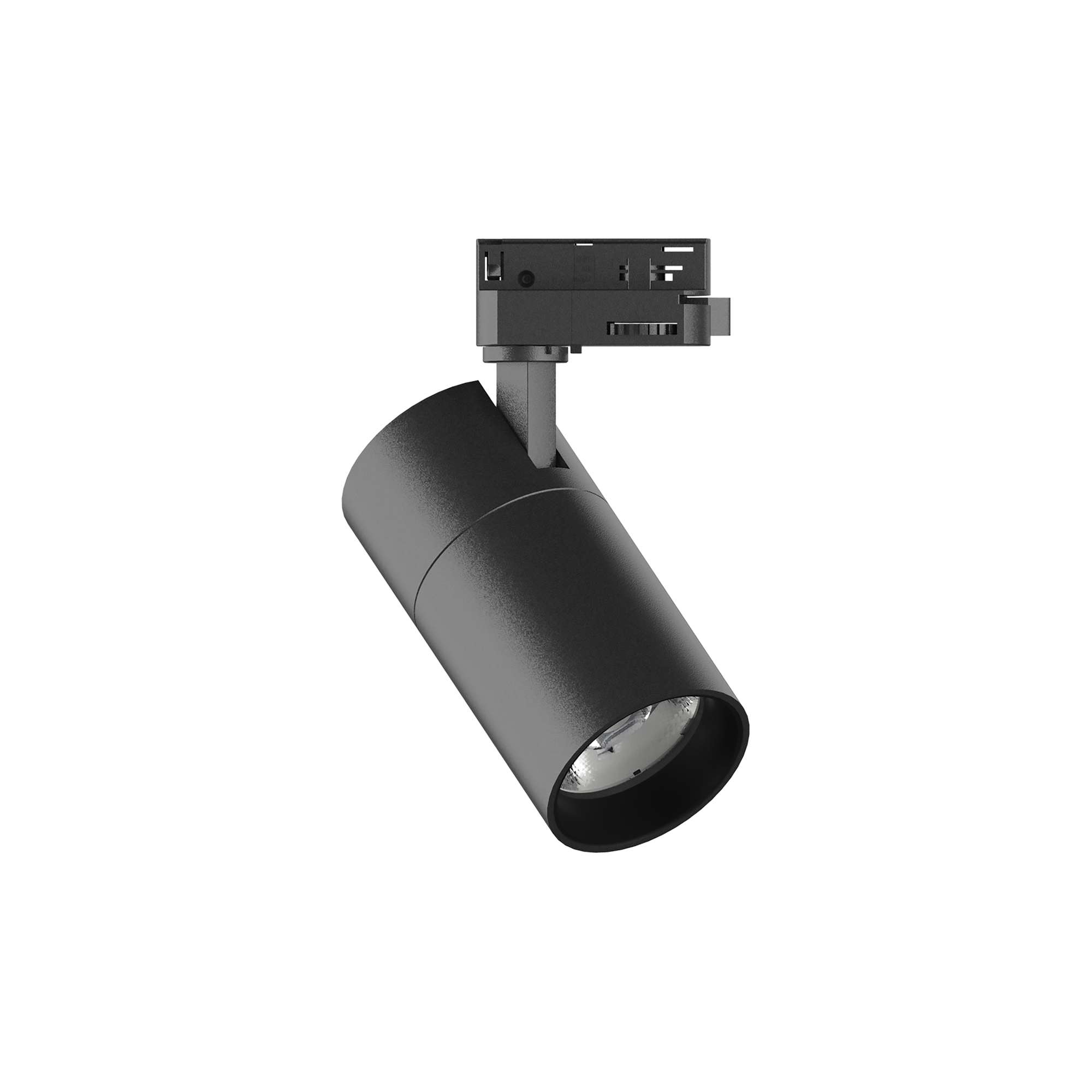 Zylindrischer Scheinwerfer aus stranggepresstem Aluminium, geeignet für die Installation an einer Drehstromschiene. Weiß oder schwarz pulverbeschichtet, 355° drehbarer und 90° schwenkbarer Kopf.