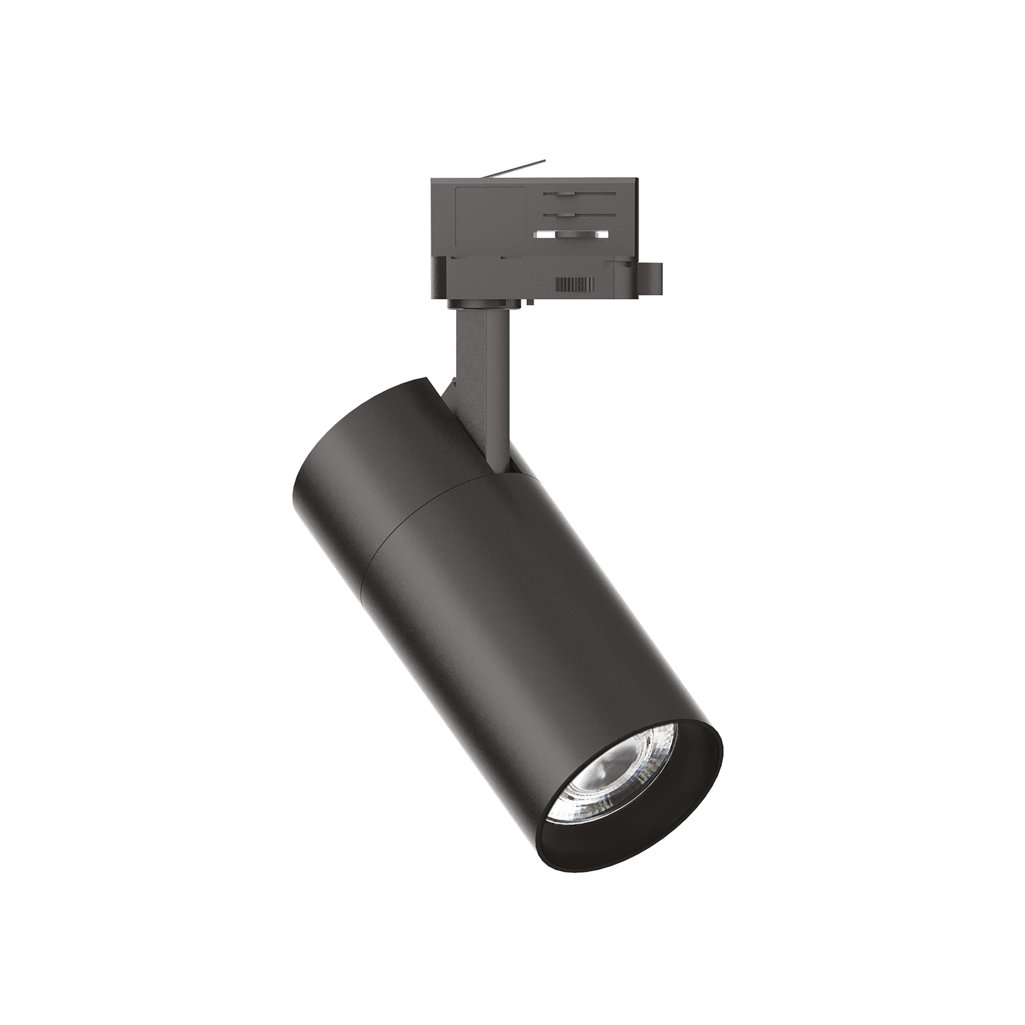 Zylindrischer Scheinwerfer aus stranggepresstem Aluminium, geeignet für die Installation an einer Drehstromschiene. Weiß oder schwarz pulverbeschichtet, 355° drehbarer und 90° schwenkbarer Kopf.
